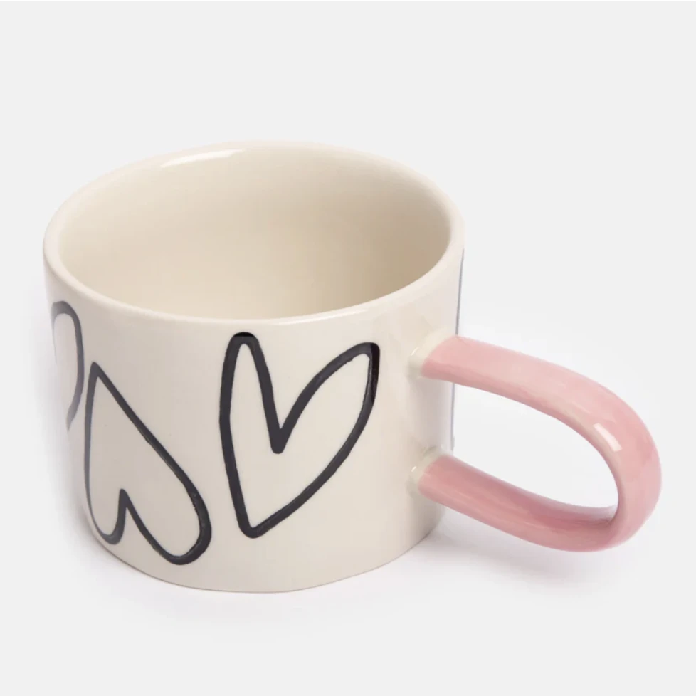 A monochrome heart outline design adorns an off- white round mug with contrasting pink elongated handle.