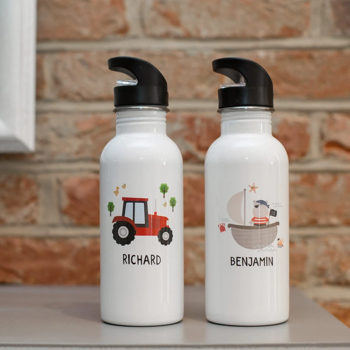These adorable water bottles can be personalised with any name of your choice. Choose from a tractor or hippo pirate!