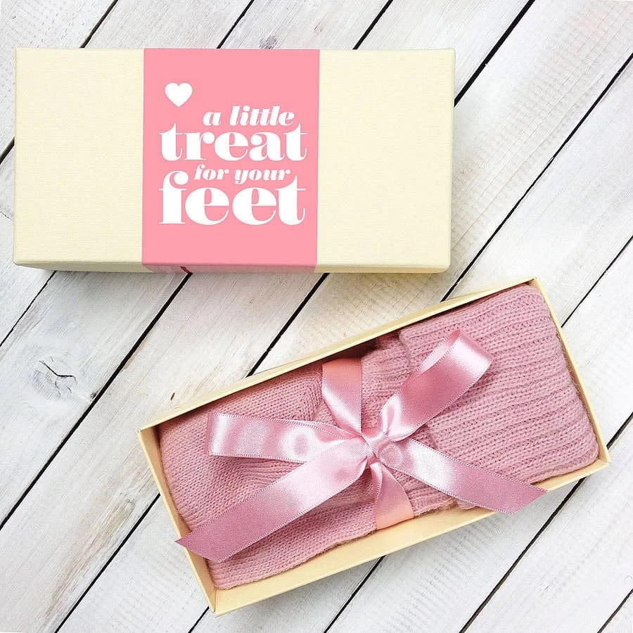 They are tied with a ribbon and presented in a box that reads ‘A Little Treat For Your Feet’ on the top and ‘We Hope These Keep Your Toes Nice And Cosy! X’ on the side.