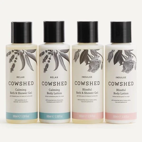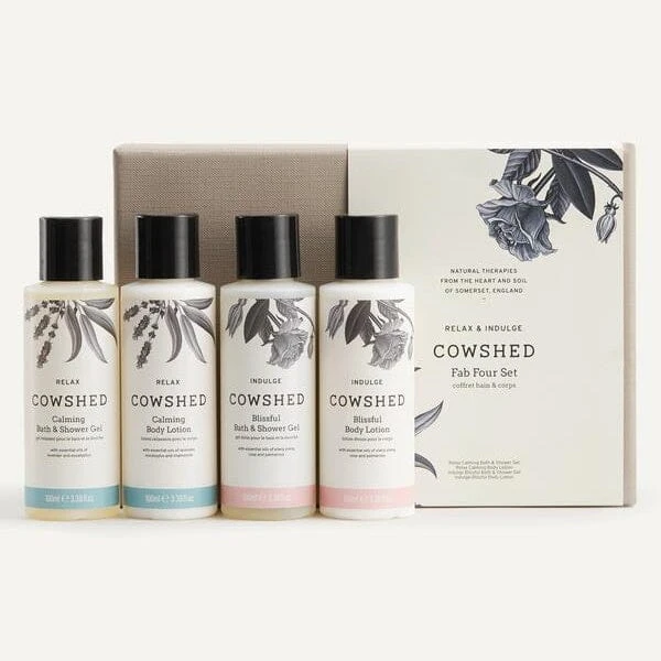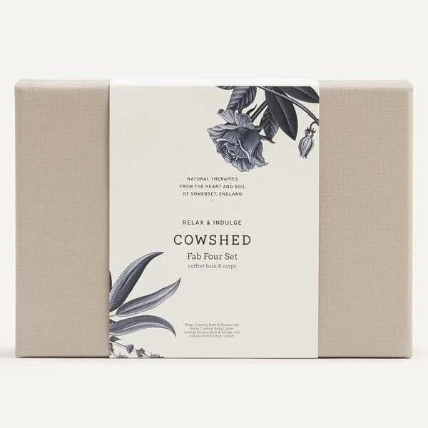 A pampering collection of four of Cowshedâs Relax and Indulge luxury toiletries, presented in a beautiful gift box â perfect to reuse as a trinket box.