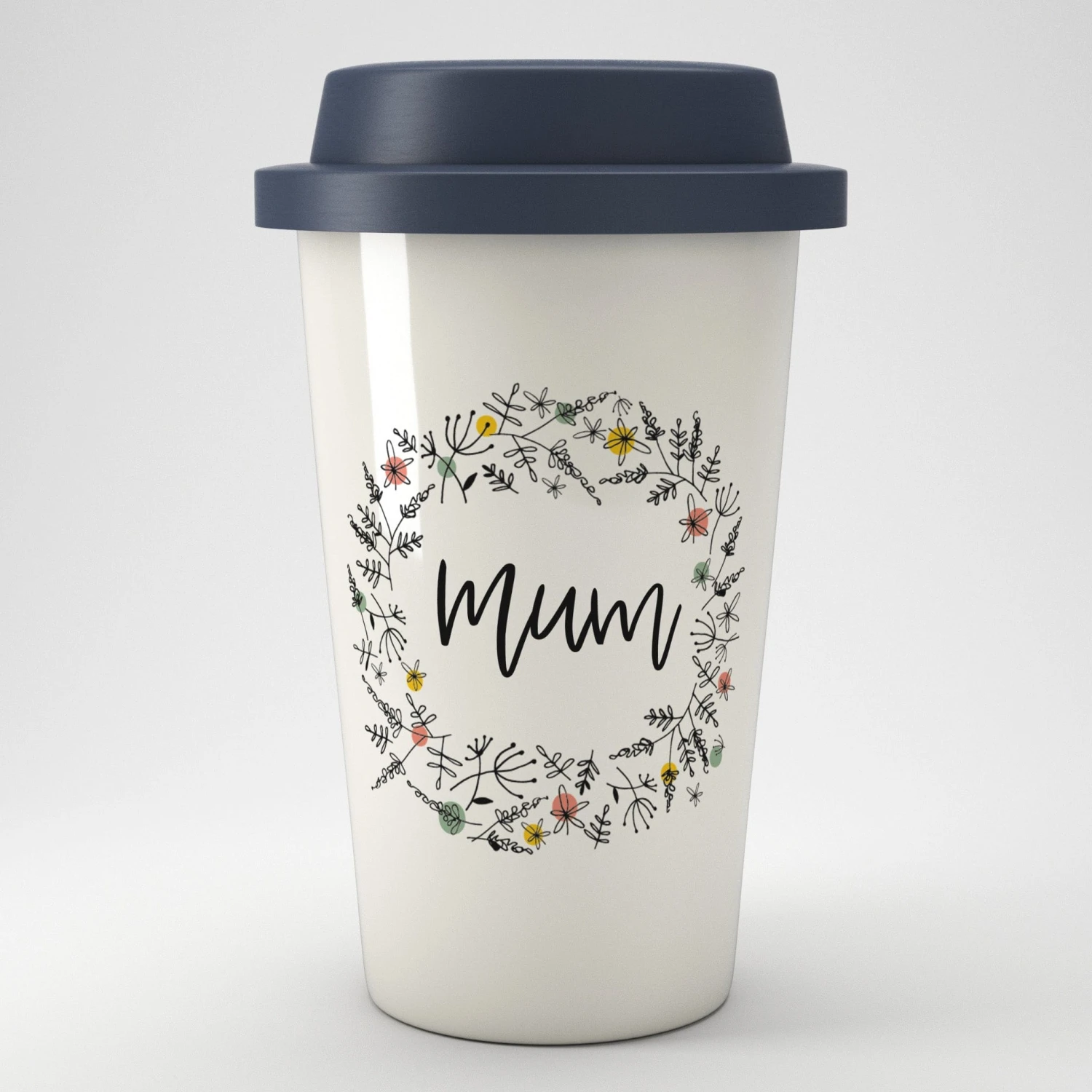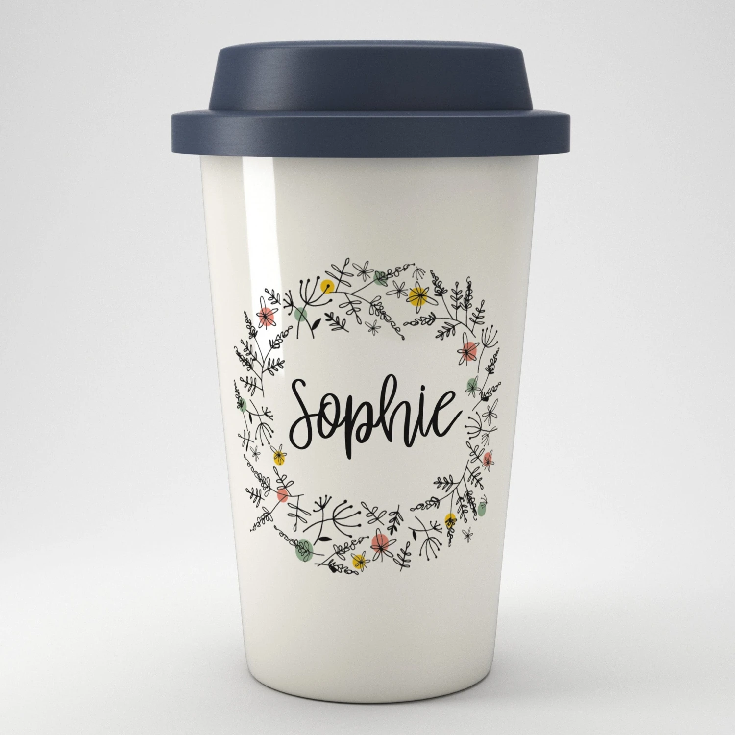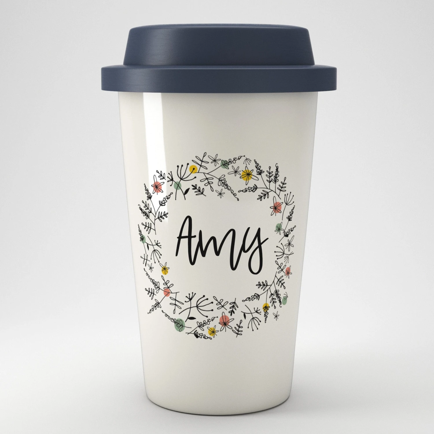 A pretty, floral eco travel mug that can be personalised with a name or nickname of your choice.
