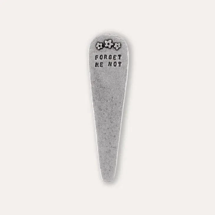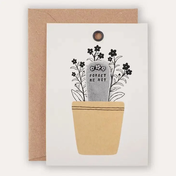 An illustrated card holding a “forget me not” plant marker with three tiny flowers.