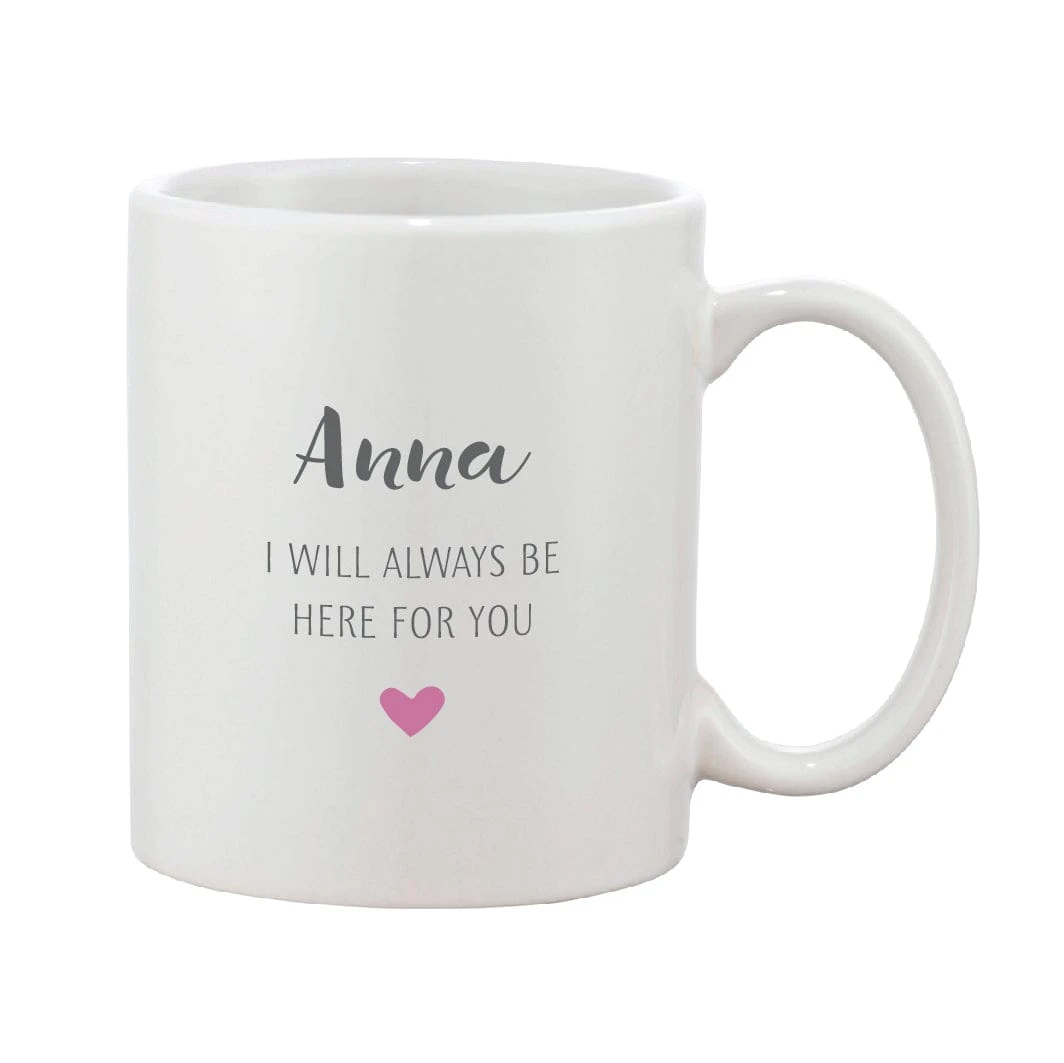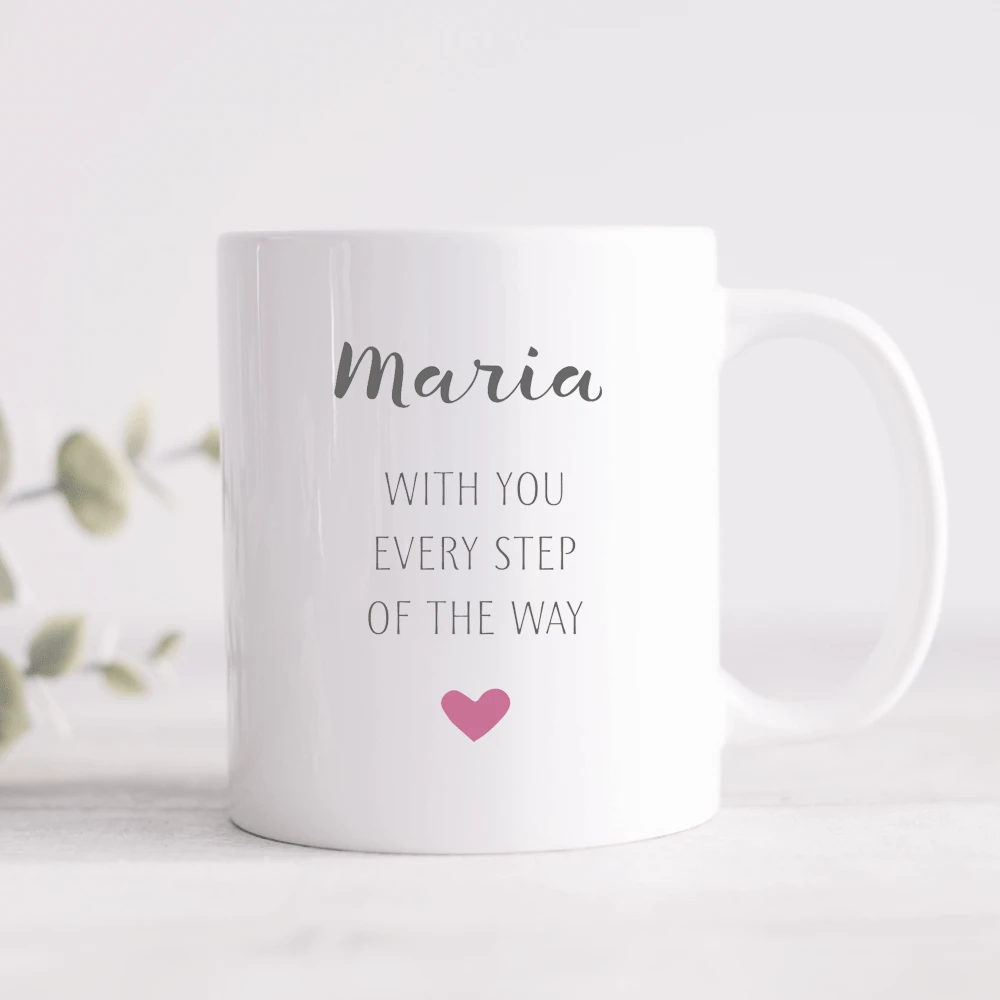 A personalised mug with a little heart and space for the recipient’s name and a personalised message.