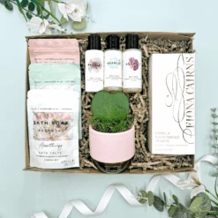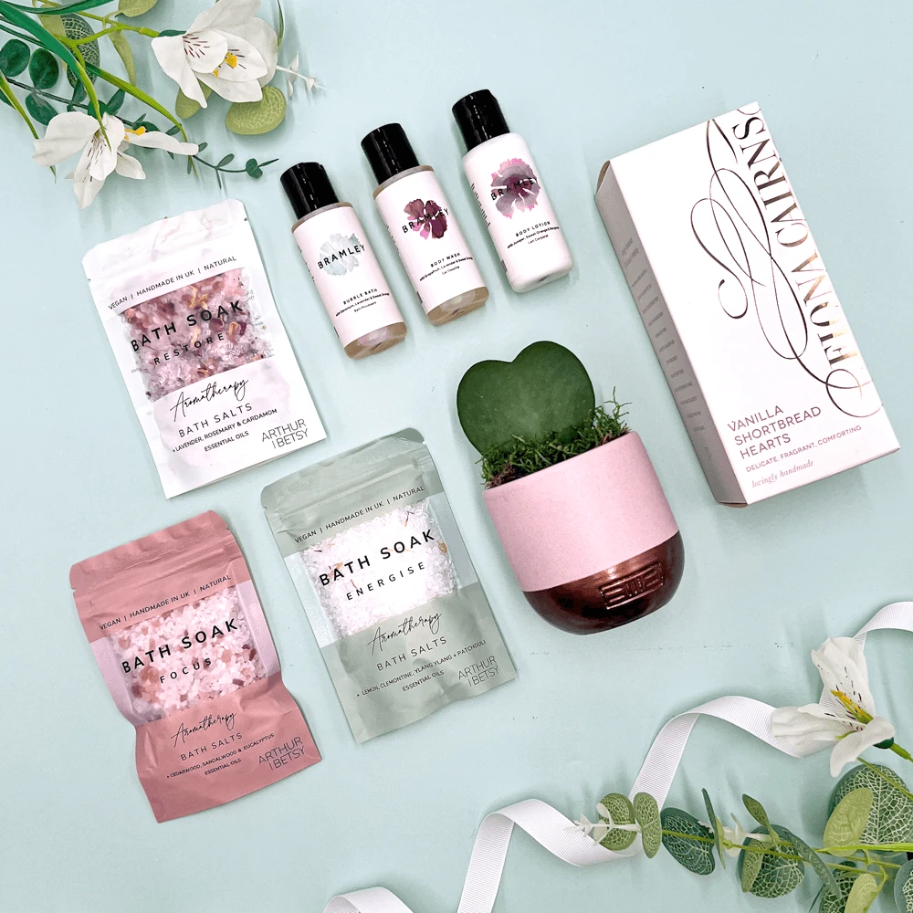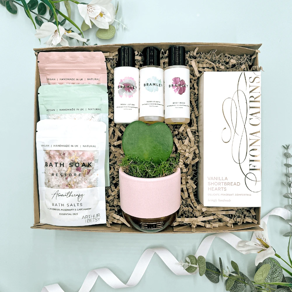 A thoughtful gift package filled with some luxurious pampering treats and, some delicious biscuits and a pretty heart shaped succulent to encourage a little calm. Lovingly packaged and ready to be sent to a loved one.