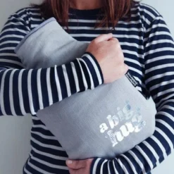 They are soft and padded to make them extra huggable. Made of grey linen, the silver metallic print reads ‘A Big Hug’ or ‘A Little Hug’ depending on which size you choose.