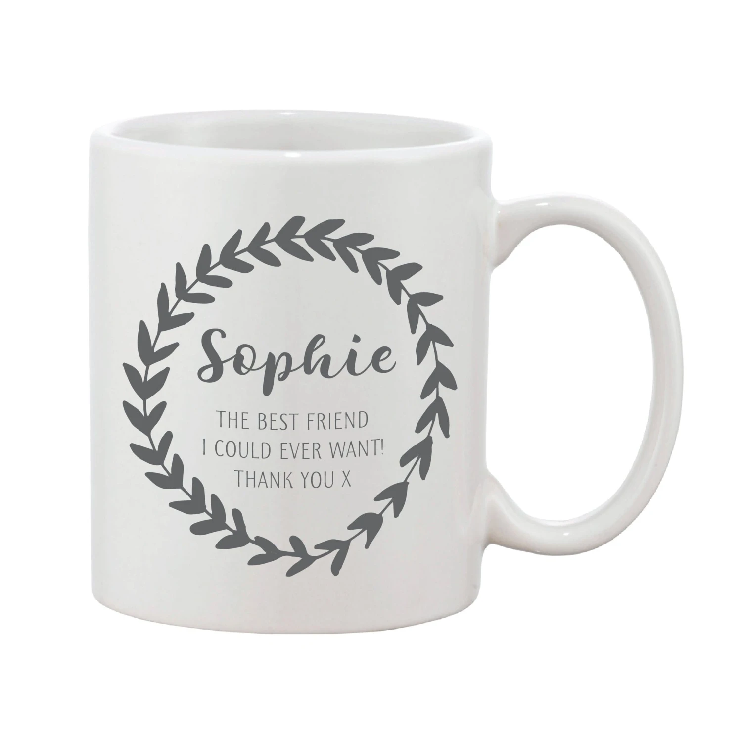 A personalised thank you mug with space for the recipient’s name and a personalised message.