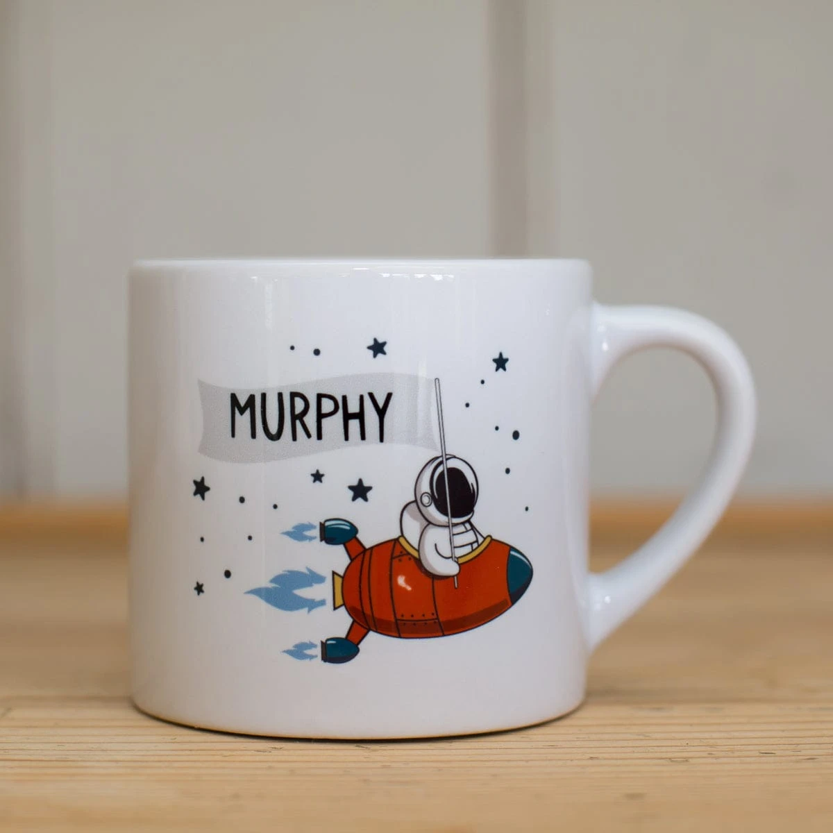 This cute rocket mug can be personalised with any name of your choice.