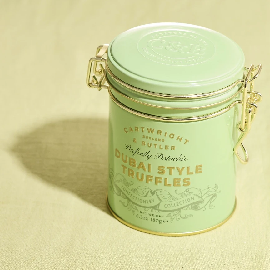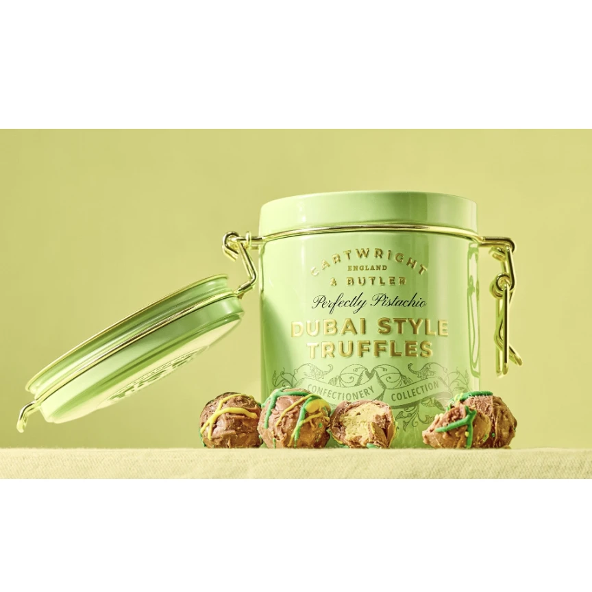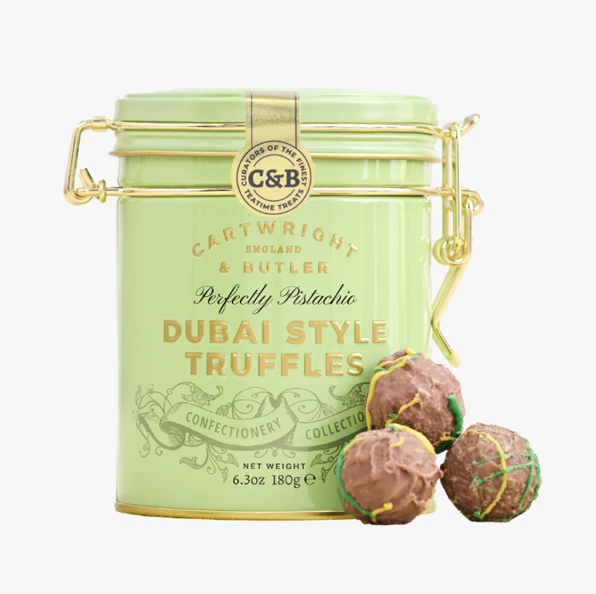 Melt-in-the-mouth milk chocolate filled with a creamy pistachio ganache, knafeh crunch, and finished with a vibrant yellow and green drizzle. These irresistable Dubai Style Truffles are a new favourite at Cartwright & Butler HQ.