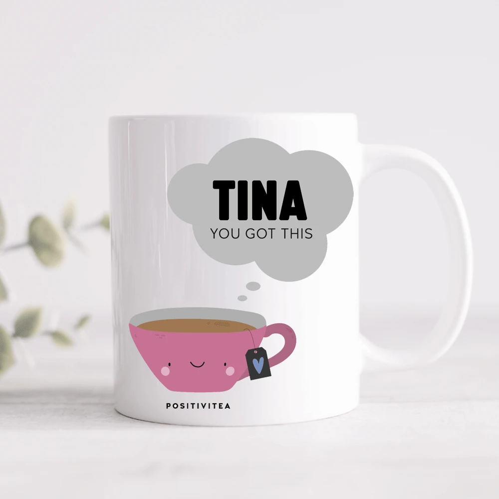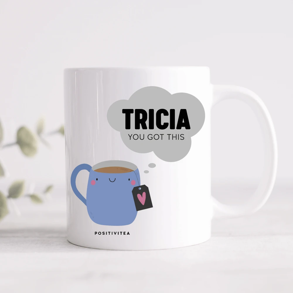 This cute mug features a cup of ‘positivitea’ to send positive vibes to your loved one and can be personalised with any name of your choice.
