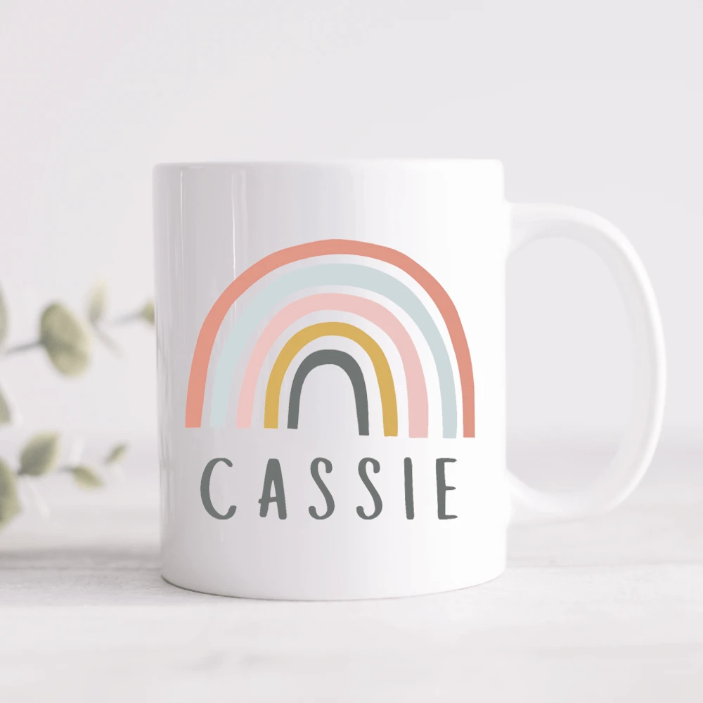 A pretty rainbow mug, personalised with any name or nickname of your choice.