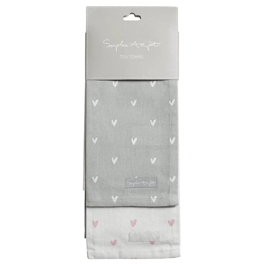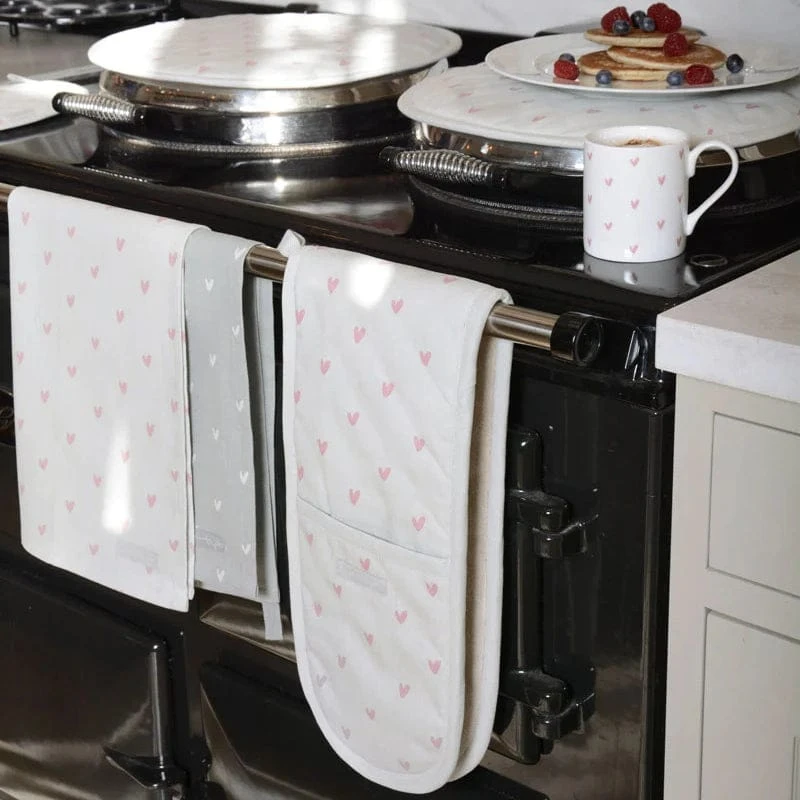 100% cotton and measuring 45cm x 65cm, the pretty design in pink hearts on cream or white hearts on grey will suit any kitchen.