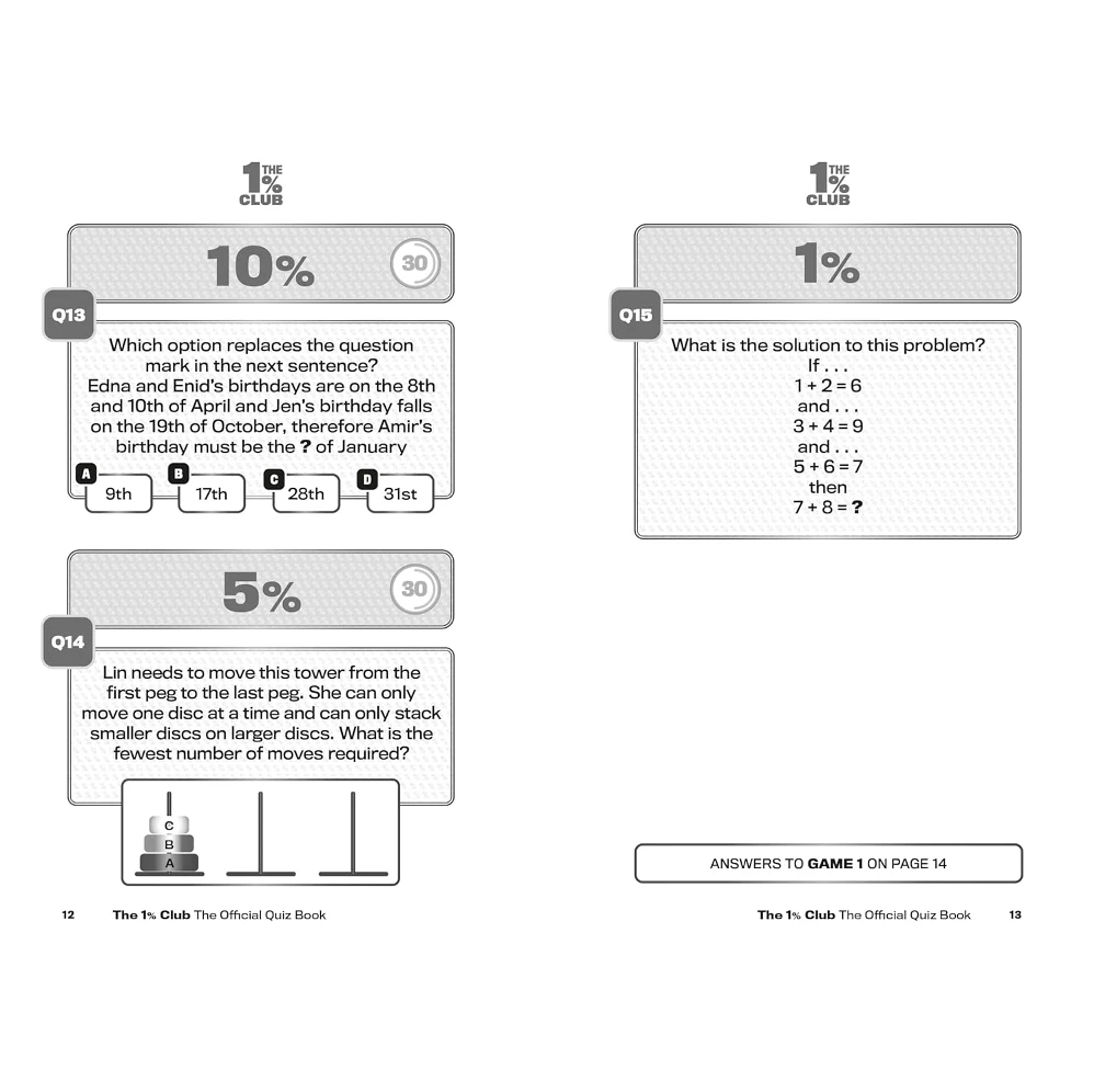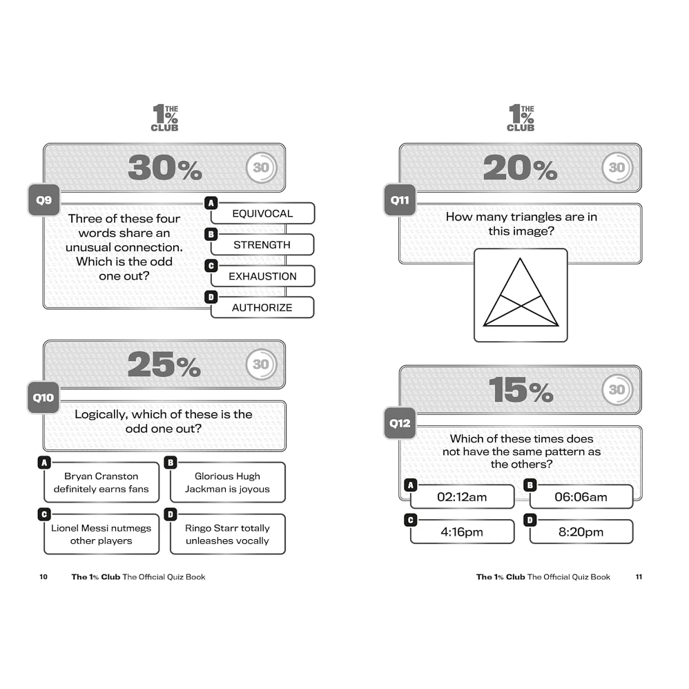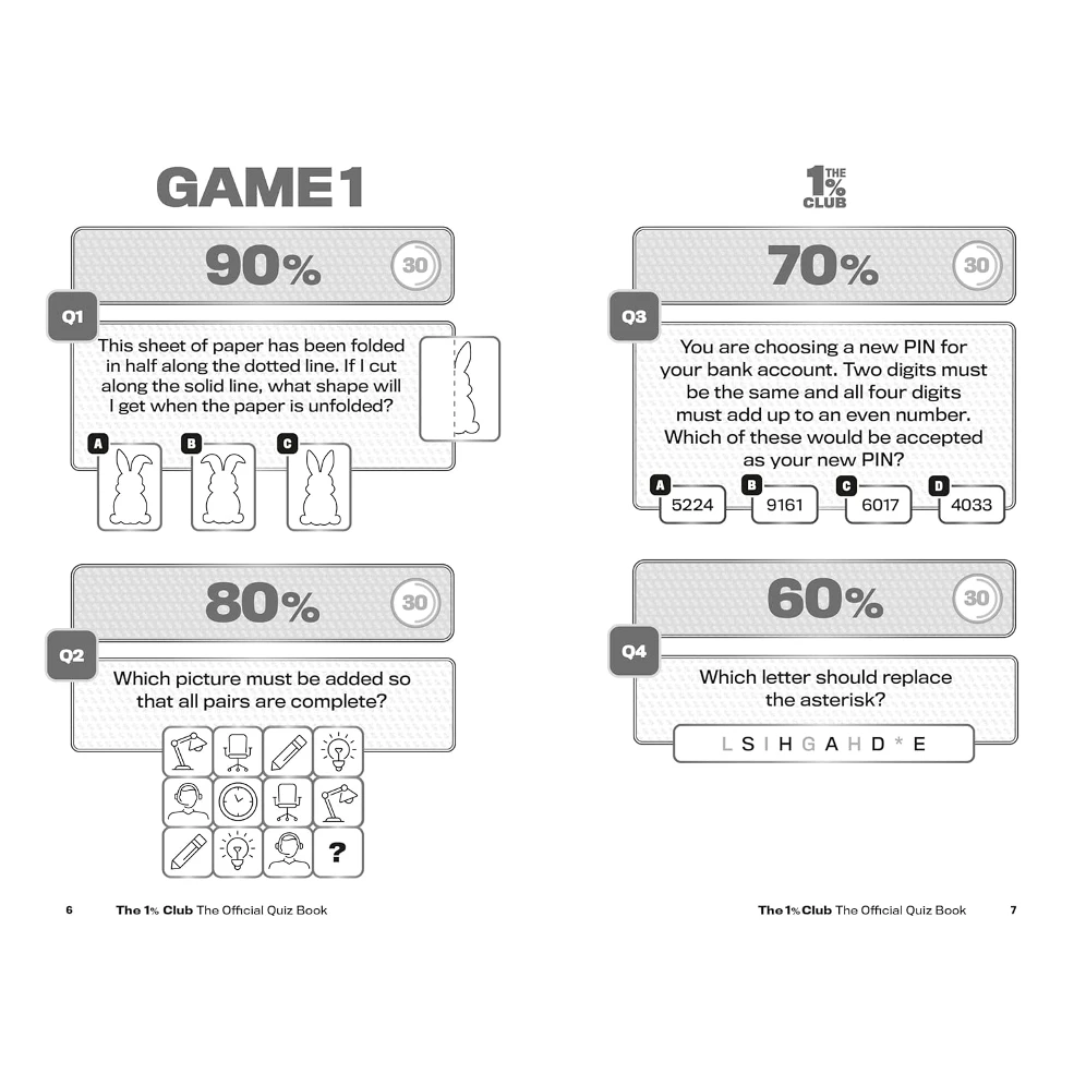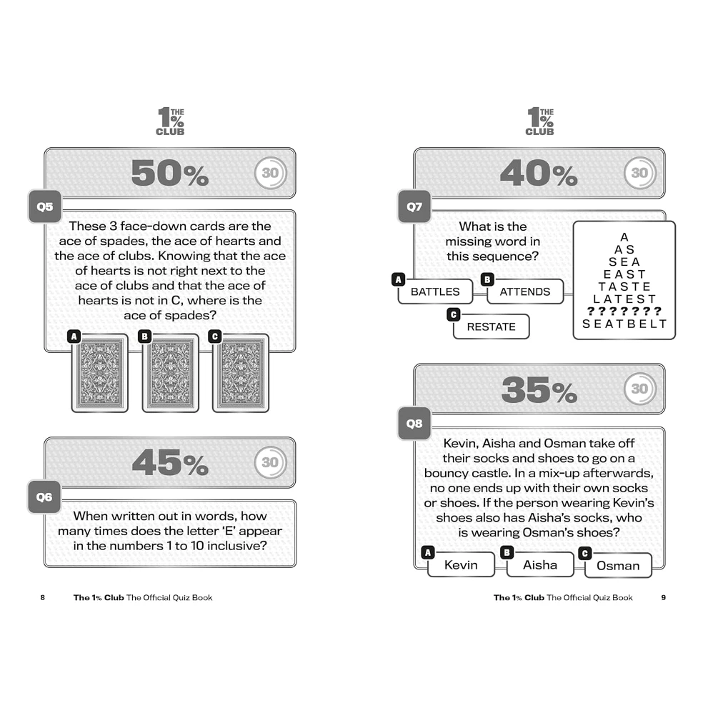 The 1% Club Official Quiz Book, brought to you by the team behind the hit TV show, is a quiz book for all the family, where an 8-year-old has as much chance of winning as an 80-year-old, where intelligence is not based on how many exams you passed, it’s all about how your brain works. Logic and common sense are the key to success.