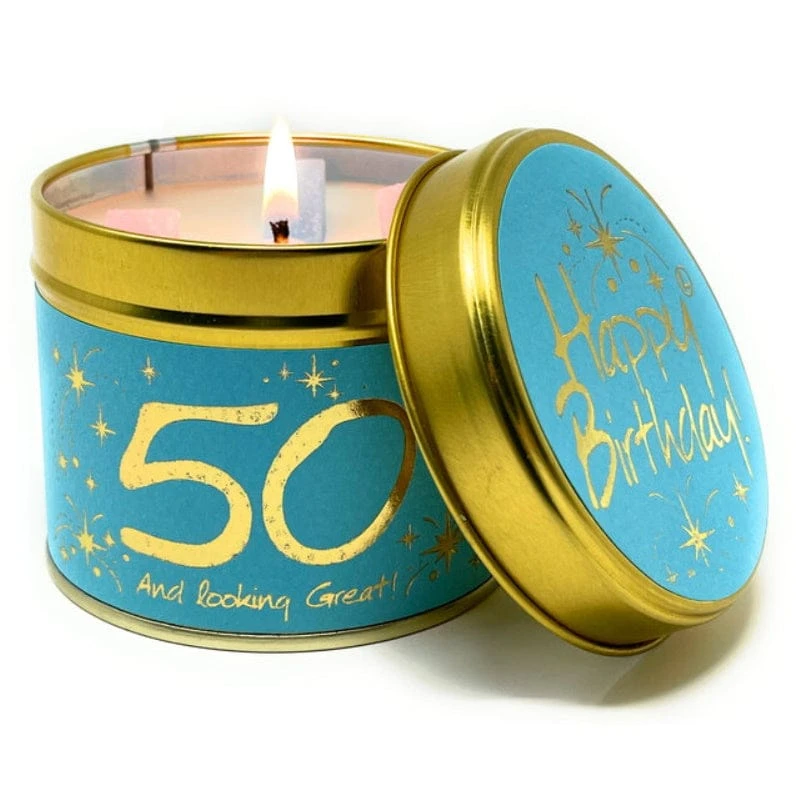 - A 50th Birthday Candle – “50 – And Looking Great!” This candle is presented in a decorated tin, is vegan friendly & cruelty free, and has a burn time of 35 hours. These fruity candles have middle notes of Peach, Rose and Mango, with top notes of Strawberry and Pineapple.