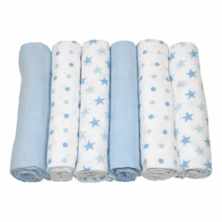 - Blue Stars & Spots Muslins – muslins are an absolute must for new babies and tiny people, the list of uses is endless! (Please note the muslins in this gift box are those shown in the individual product image, as those shown in the main image are now discontinued.)