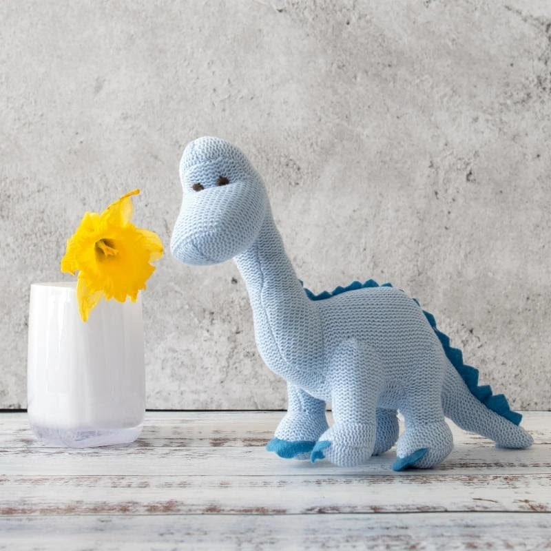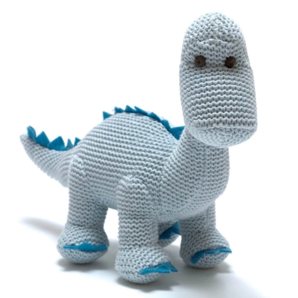 - Organic Knitted Dinosaur Rattle – tactile, and with a sweet sounding rattle, this makes a great baby gift for young babies. 17cm x 24cm.