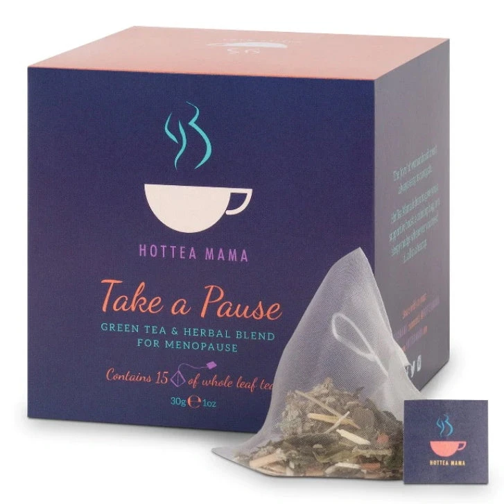 - Hottea Mama Take A Pause Tea â a special blend of refreshing, herby whole leaf tea bags. With green tea top notes, and a sweetness from liquorice, this tasty tea is designed to support and offer relief through the tough menopause transition. Recommended to be sipped as a cold drink so as not to worsen hot flushes! Includes 15 whole leaf, plastic free, biodegradable tea pyramids. Vegan and gluten free.