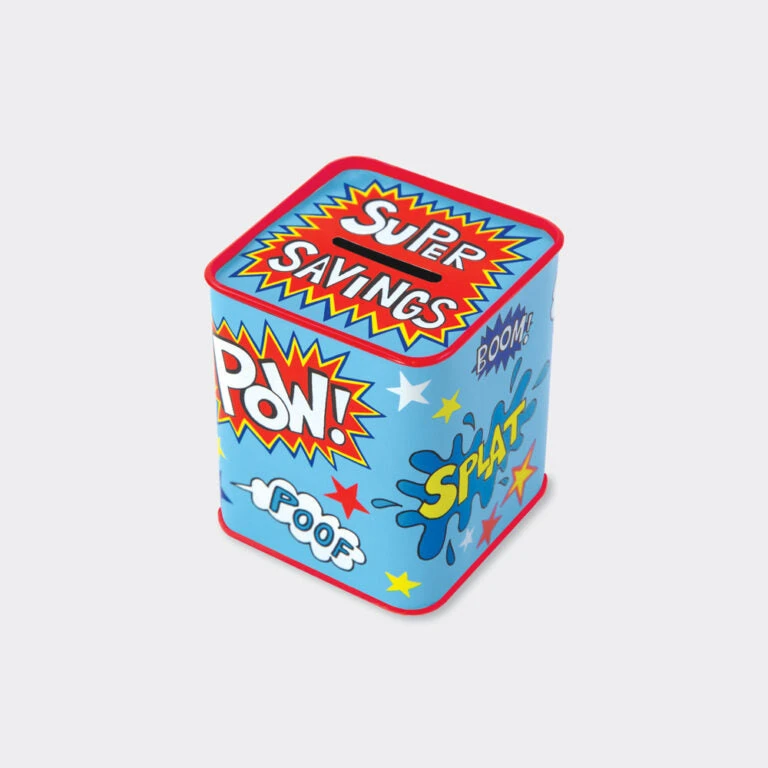 - Super Hero Money Box – a colourful children’s money tin with super hero motif design has a slit in the top to put coins through and a removable base.