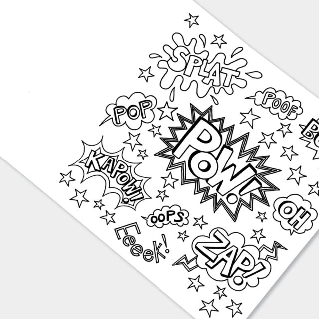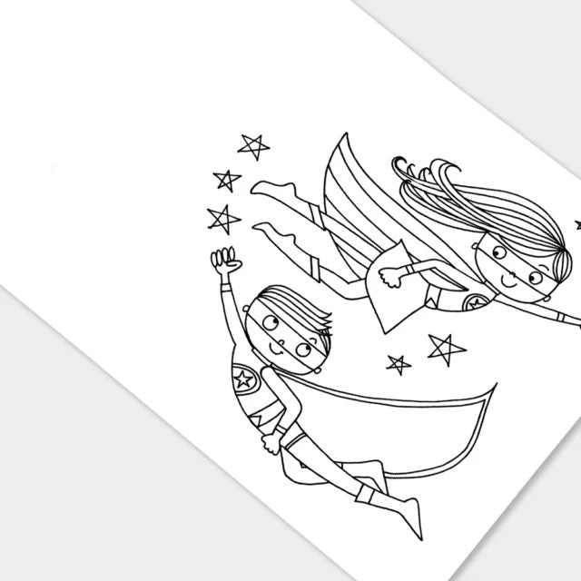 - Super Hero Colouring Book – 12 pages of cute characters with the reverse side of each page left blank for your own creativity.