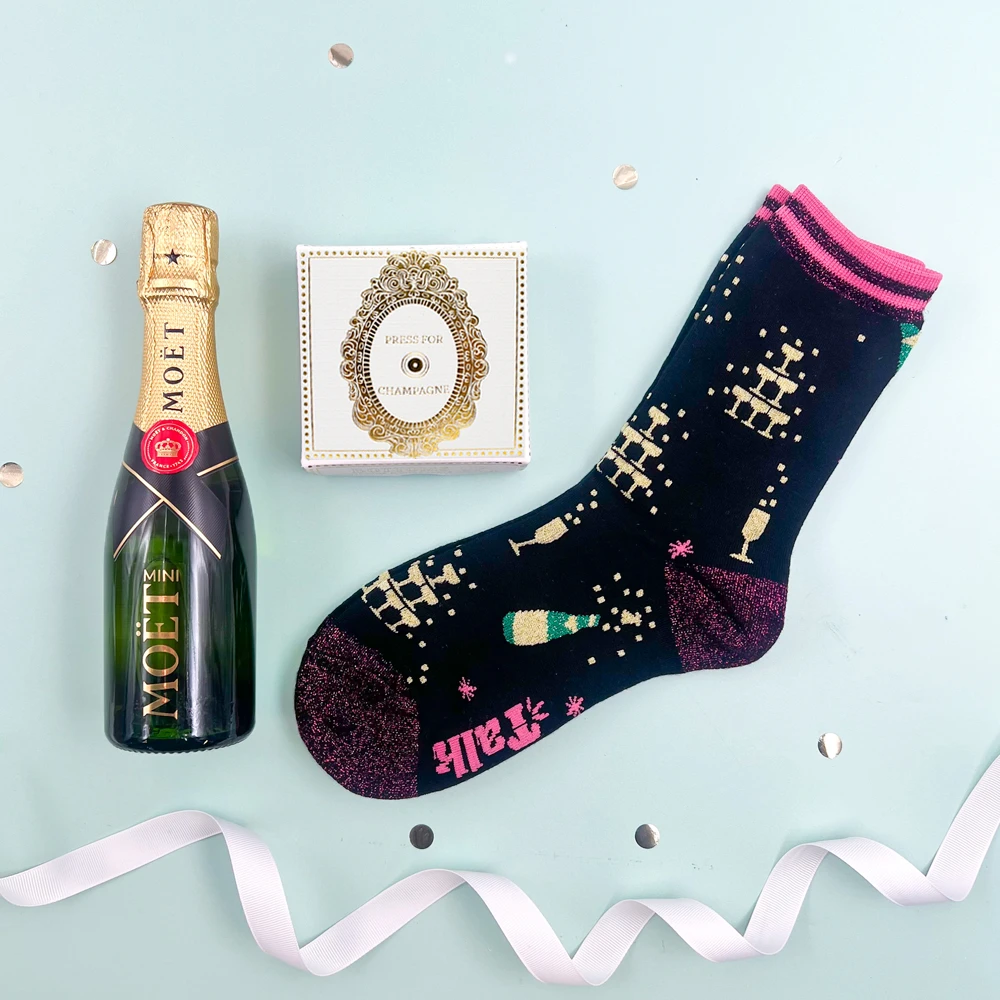 - Champagne Glitter Socks – a pair of women’s cotton socks with a champagne and bubbles design. Made with soft natural cotton infused with delicate metallic fibres that are breathable on the skin. UK size 4-7.