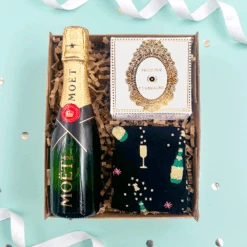 A luxurious hamper filled with champagne, chocs and socks. Perfect to say congratulations, thank you, well done, or simply to send for someone who deserves a decadent pamper! The ‘Press For Champagne’ Gift Hamper includes:
