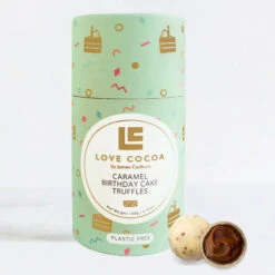 - Birthday Cake Truffles 150g – Gooey, rich caramel surrounded by chocolate ganache, enclosed in a smooth white chocolate shell and a scattering of bright sprinkles.