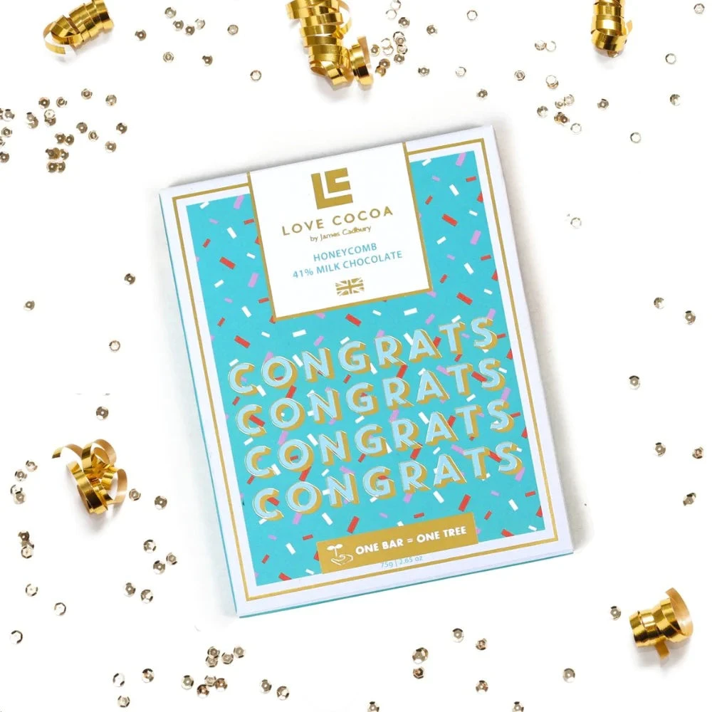 - Congratulations Honeycomb Chocolate Bar 75g – Sticky honeycomb, made in Britain, combines with Colombian milk chocolate to create this sweet bar of joy -perfect for celebrating your own happy moment!