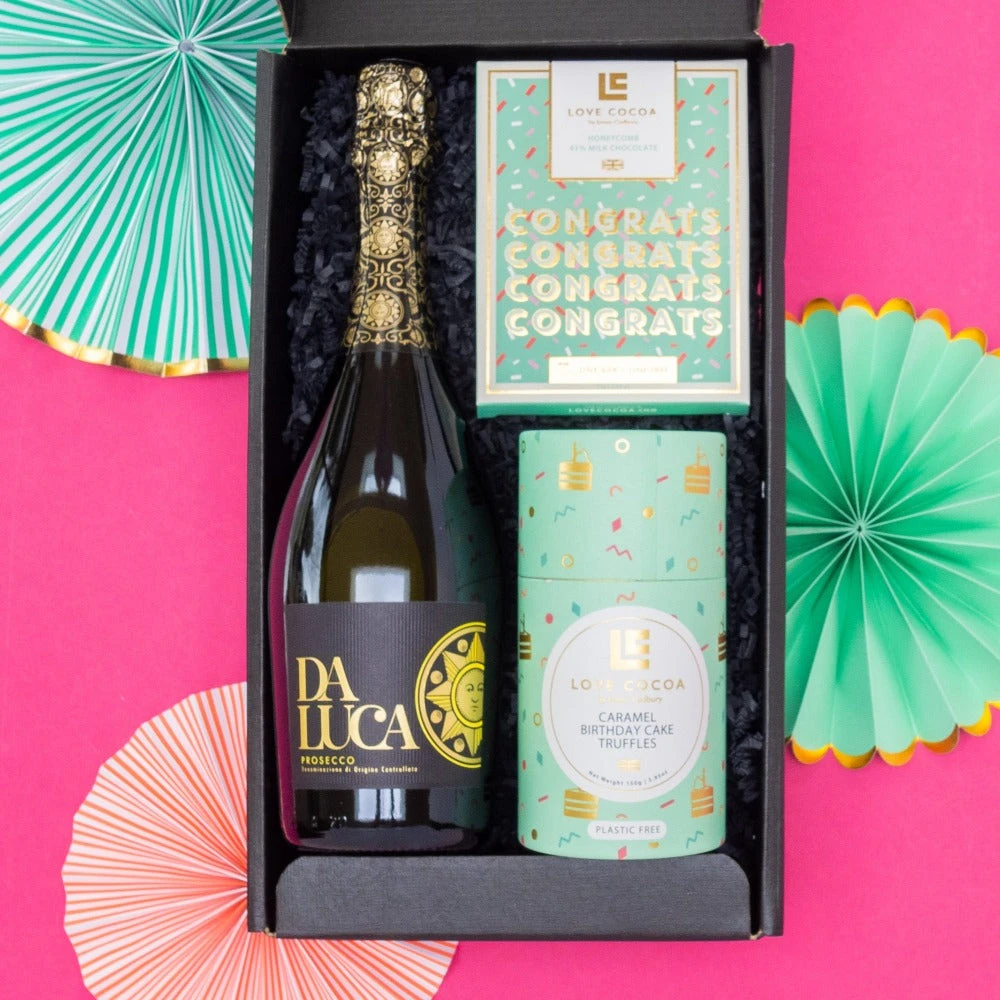 Happy Birthday To You! Wish them the happiest of birthdays with this gift box containing a full size bottle of Prosecco, some birthday cake truffles and a bar of delicious honeycomb chocolate. YUM!
