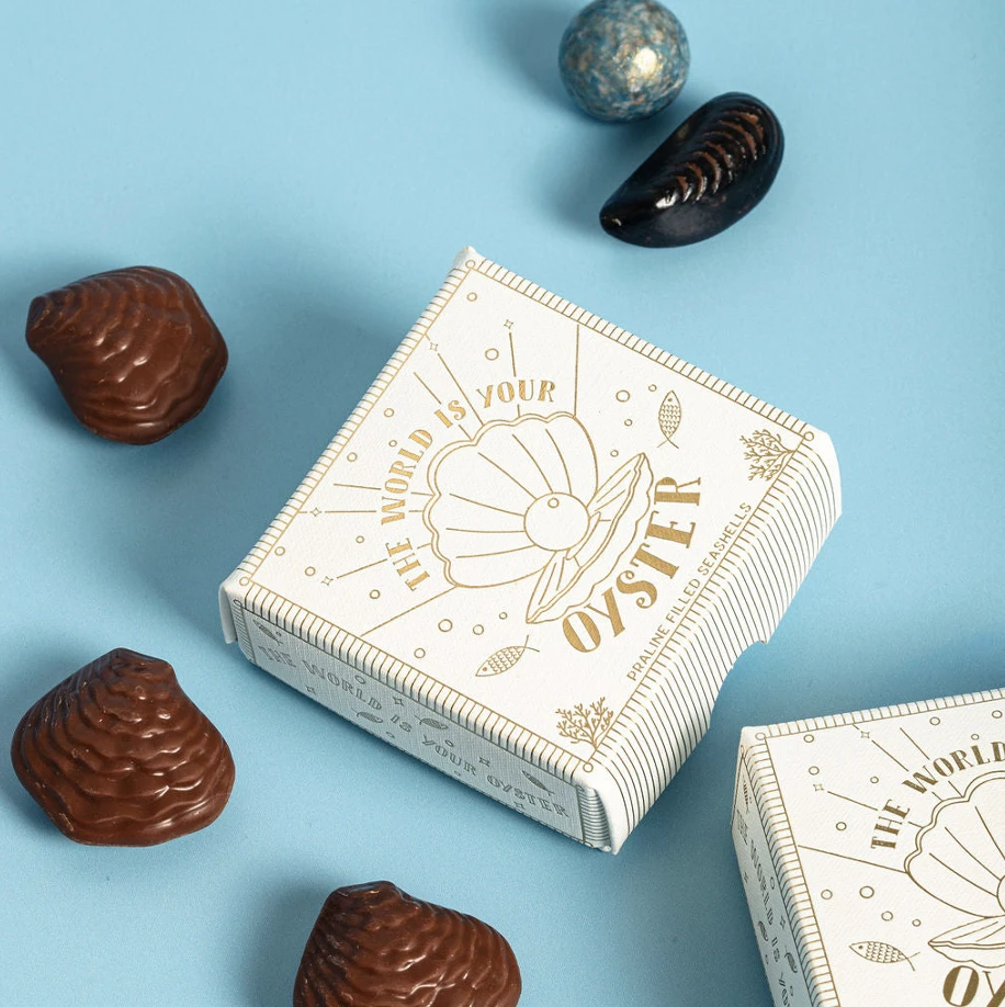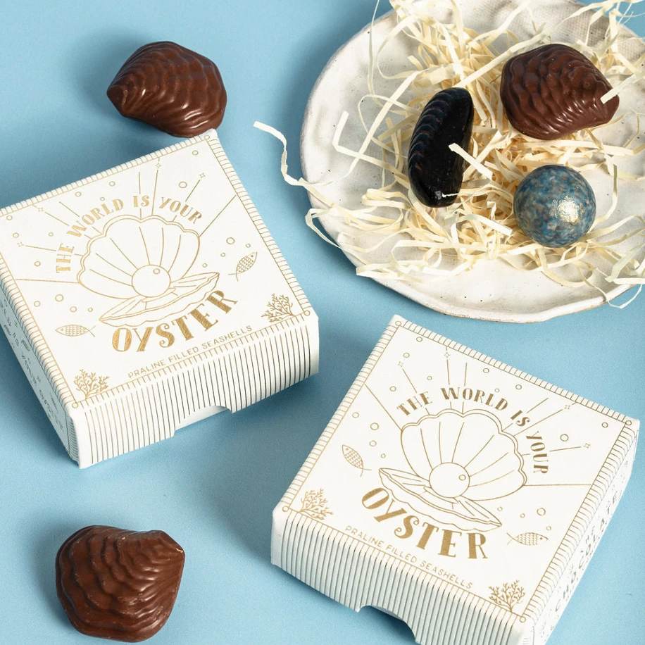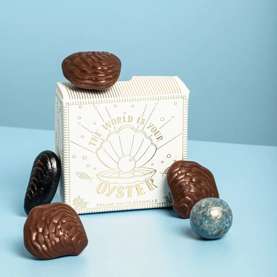 โThe World is Your Oyster!โ celebrate wonderful achievements and milestones with aย beautifully original gift. A selection of praline seashells and one chocolate oyster.