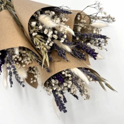 Approximately 25-30cm tall and 7cm wide, this dried flower arrangement comes with a clear vase.