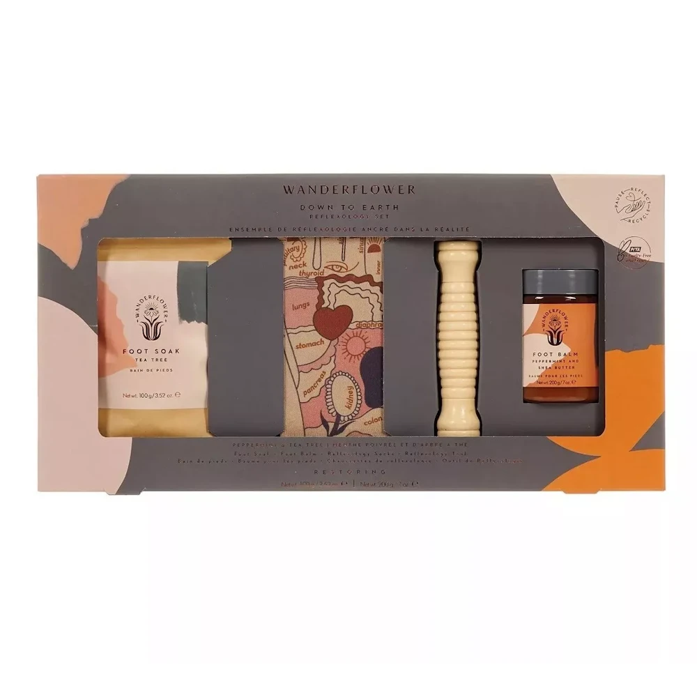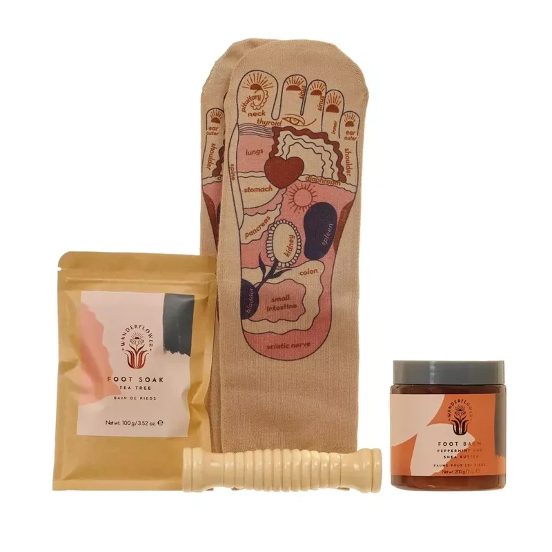 Start by gently massaging the foot balm into your feet, slip on your reflexology rocks and allow a minimum of 5 minutes for the balm to be absorbed and nourish your skin. Then use the wooden roller and gently massage your feet, using the diagram shown on your socks to focus on the areas of the body that need the most attention. Then finish off with a final foot soak.